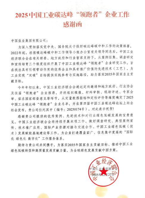 12月27日,中国工业经济联合会第四届中国工业碳达峰论坛在山东青岛举行,中国盐业集团有限公司(以下简称“中盐集团”)获评中国工业碳达峰“领跑者”企业。此项荣誉是对中盐集团深入贯彻落实习近平生态文明思想,积极践行绿色低碳发展战略的充分认证,也是对中盐集团以科技创新为引领,推进传统产业智能化、绿色化转型发展,积极探索新质生产力,勇担央企责任和国家盐业公司社会责任的高度肯定。